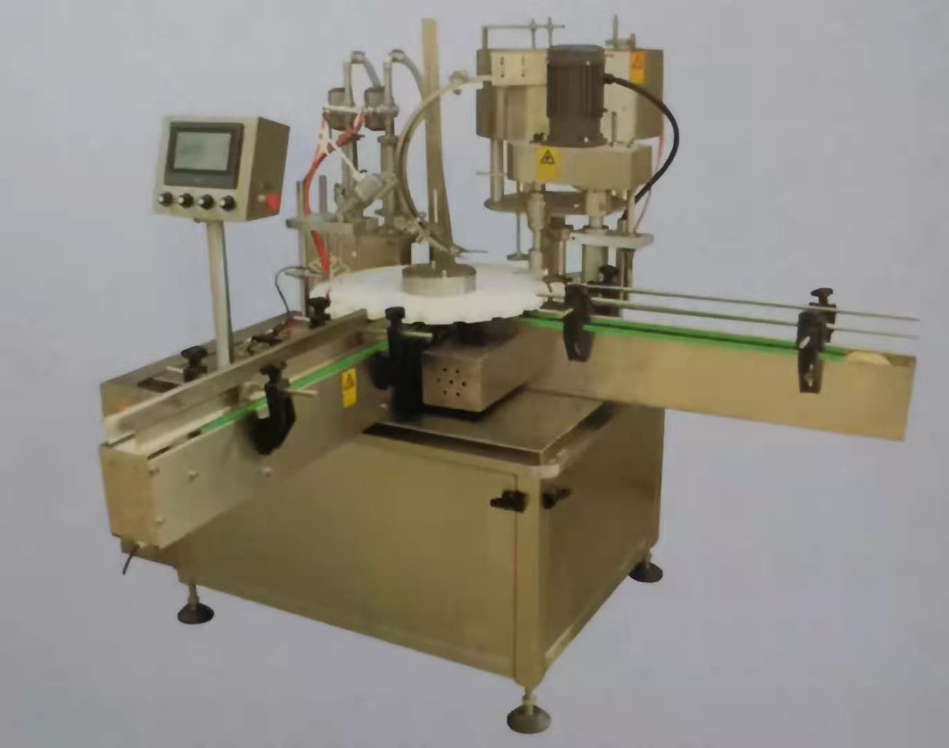 本機是集灌裝旋蓋于一體的灌裝機,適用于多品種、多規(guī)格的液體灌裝和旋蓋,由PLC微電腦控制,一切操作均在觸摸屏上完成,伺服電機驅(qū)動、容積式計量充填原理。旋蓋部分由供蓋、刮蓋、壓蓋、夾緊、輸瓶和旋蓋等來完成自動旋蓋。整機具有運動穩(wěn)定可靠、生產(chǎn)效率高、適應(yīng)性強的特點。