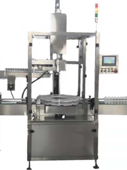 本機采用人工放泵蓋進入泵蓋輸送軌道取蓋<(利用轉(zhuǎn)盤定位瓶身)運用伺服爪式旋蓋頭抓蓋、夾導(dǎo)管〉先下行拉直導(dǎo)管插入瓶口再同時伺服兩爪旋蓋到位(帶扭矩設(shè)定)